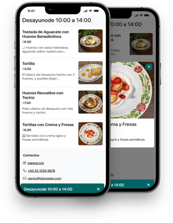 Diseño con su marca. Personalicen el estilo para destacar frente a menús QR genéricos. Vean un ejemplo en vivo.
