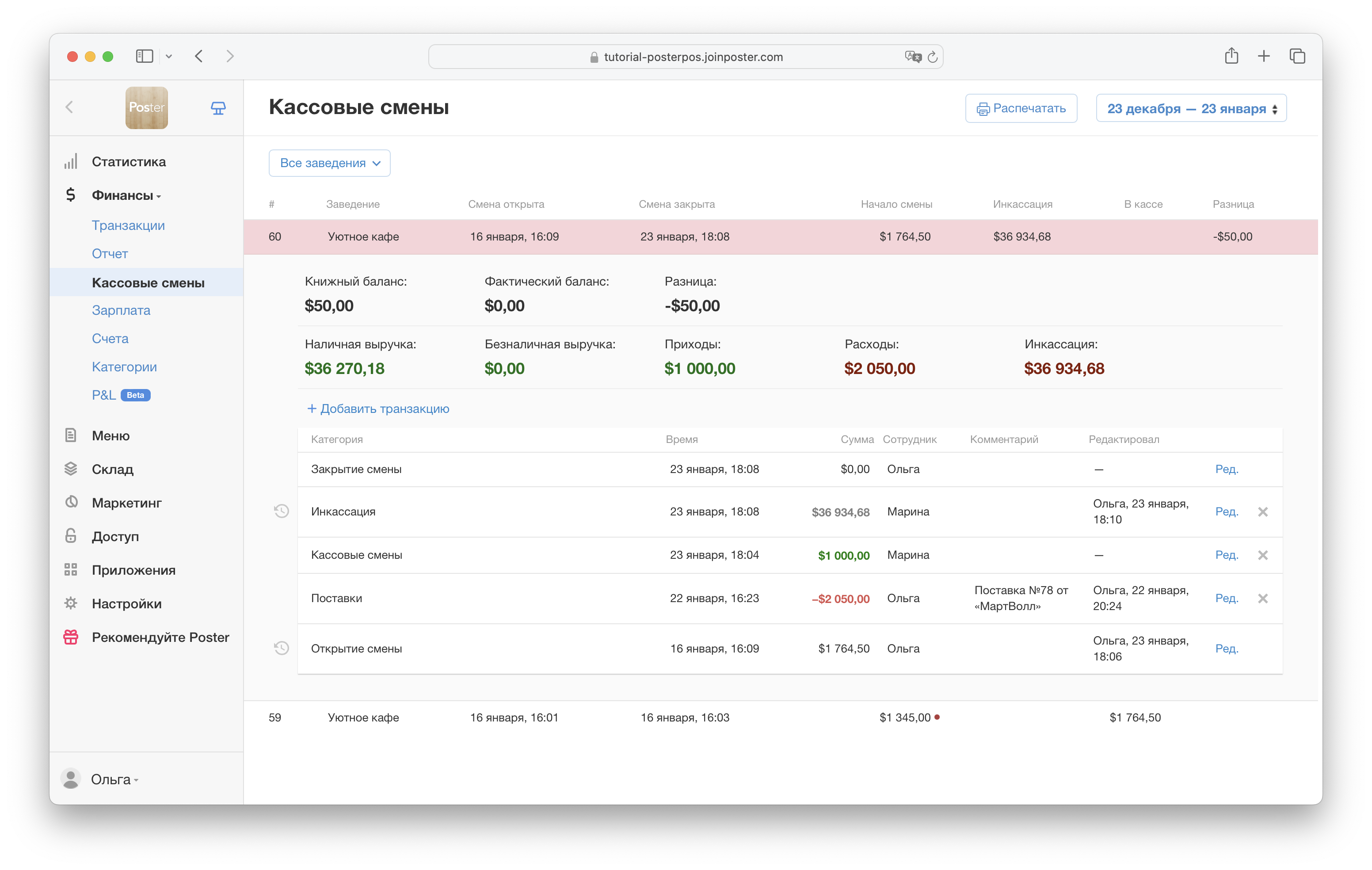 🚩 Чтобы вовремя заметить расхождение между балансами, проверяйте вкладку Финансы → Кассовые смены в админ-панели. Смены, в которых есть расхождение между книжным и фактическим балансами, подсветятся красным.