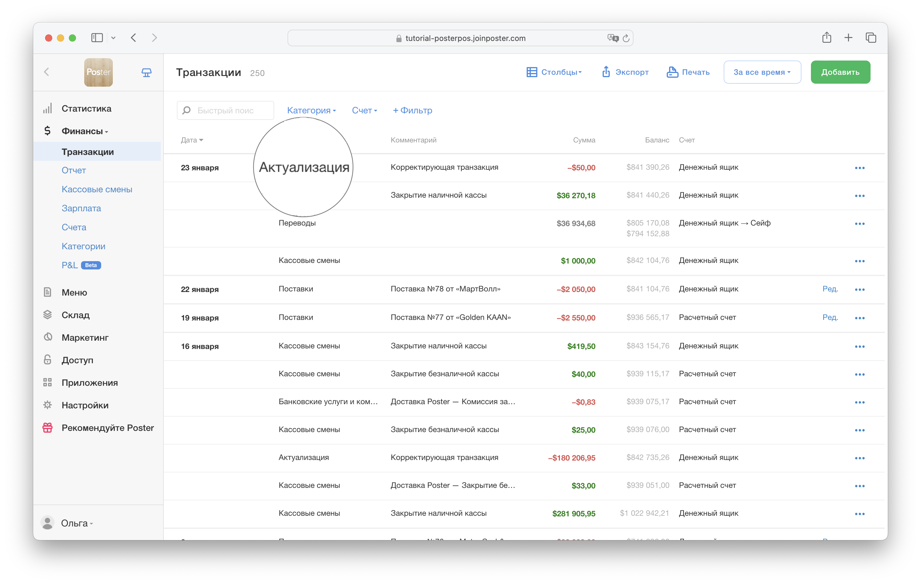 Чтобы на наличный счет попала реальная сумма денег в кассе, Poster автоматически создал актуализацию во вкладке Финансы → Транзакции. В нашем случае актуализация, то есть разница между запланированной и фактической суммой денег в кассе – $51.