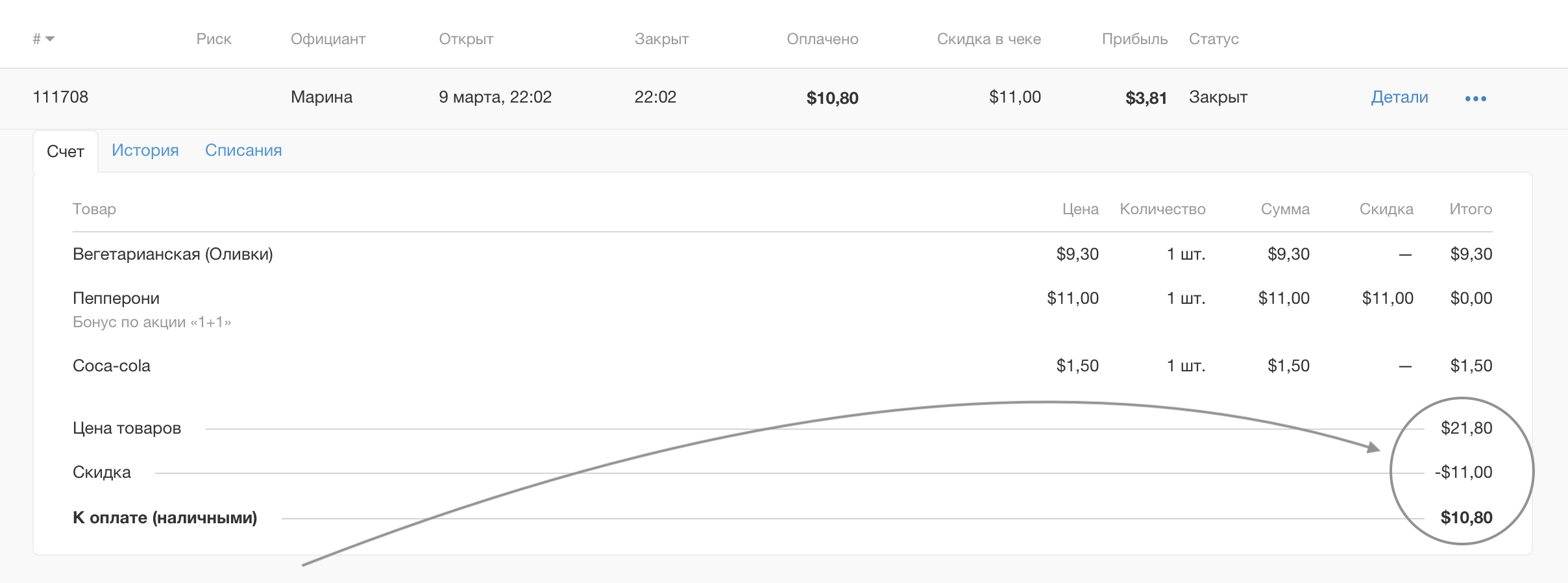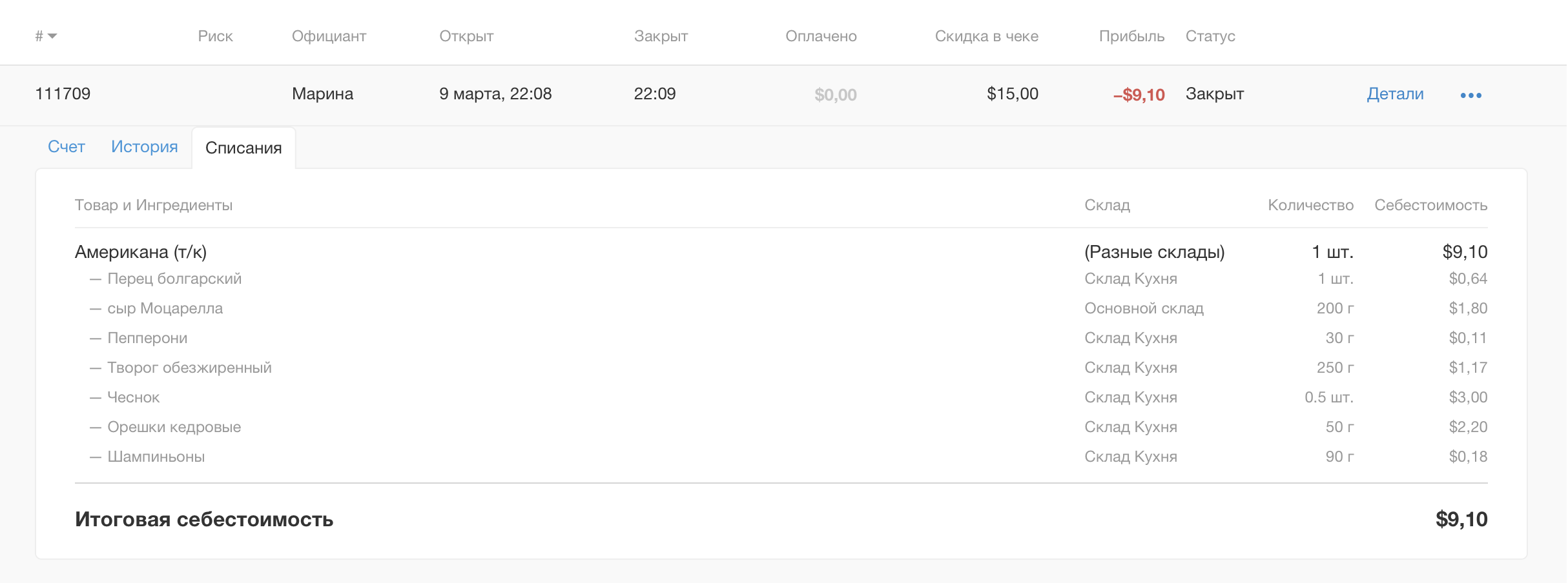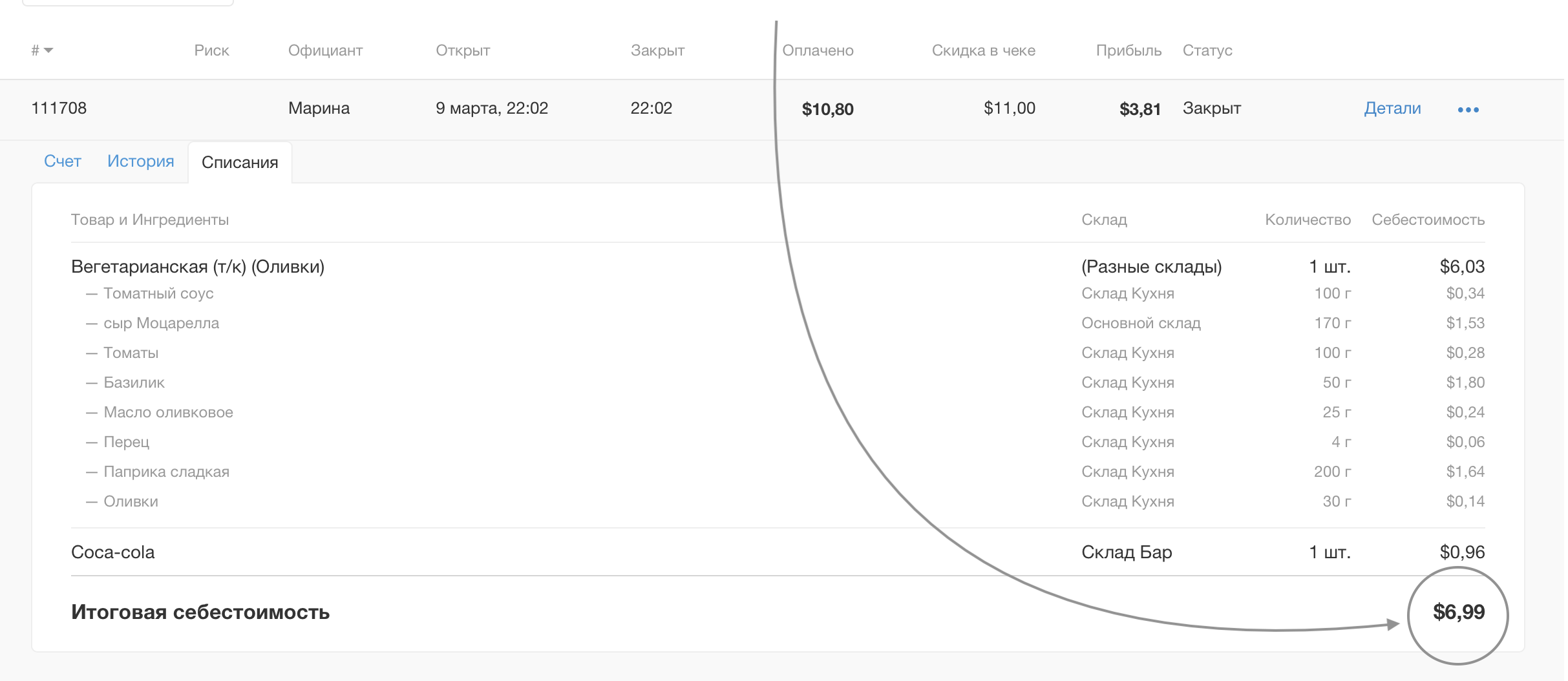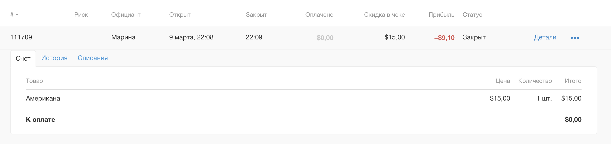 Например, если закрыли чек без оплаты, сумма выручки по такому товару будет равна 0 грн. Проверим расчет прибыли с чека. Найдем чек во вкладке Статистика → Чеки, в Деталях просмотрим счет заказа и списания.