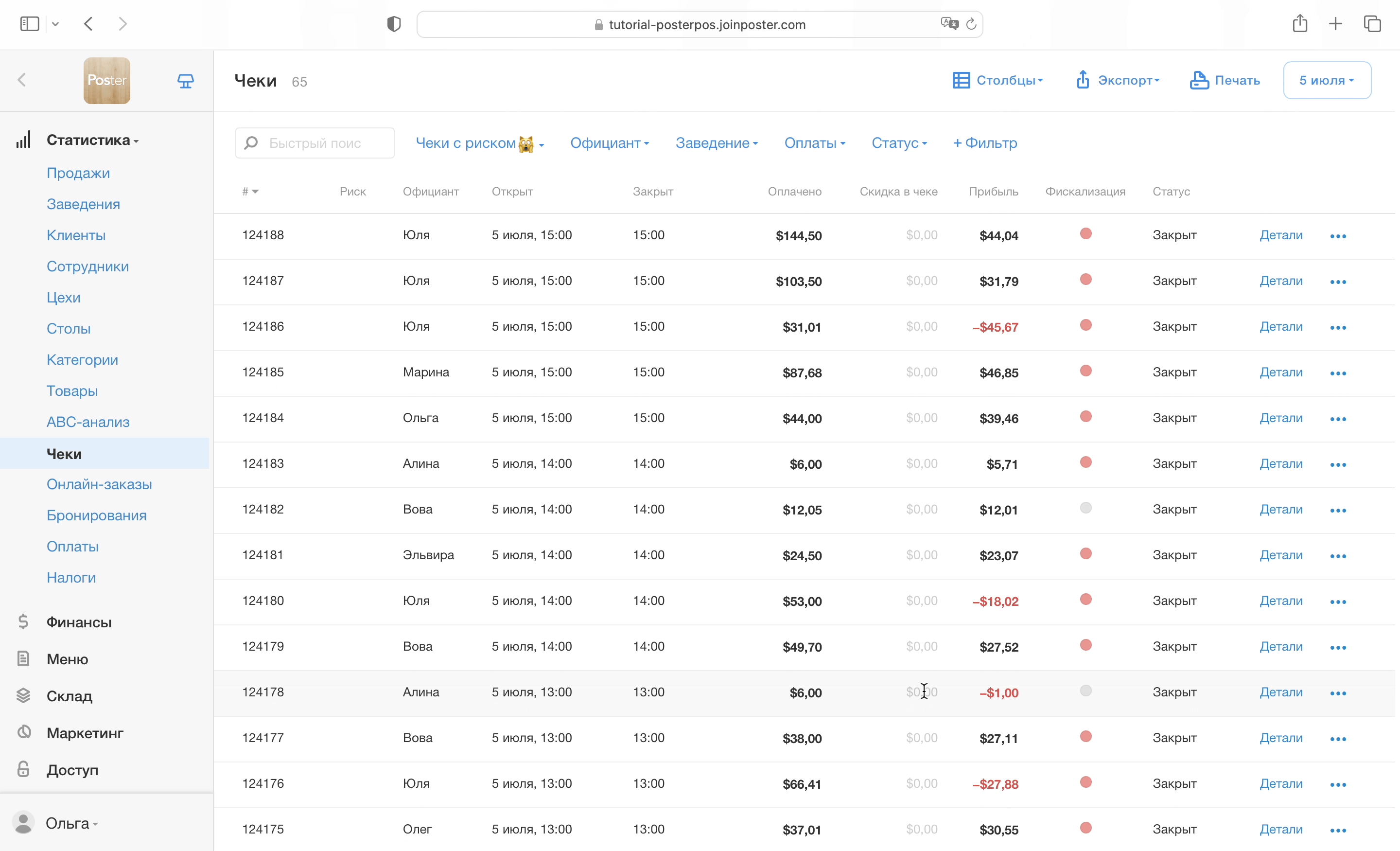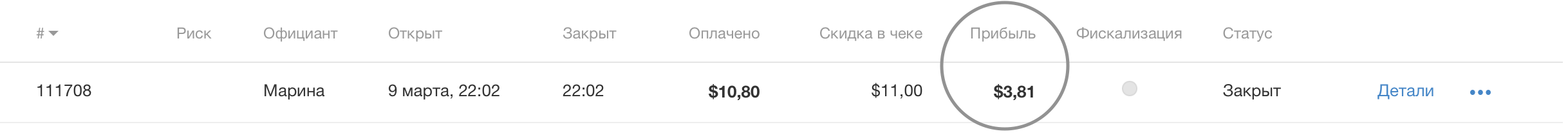 Например, вы закрыли на кассе чек со скидкой. Poster рассчитает прибыль во вкладке Статистика → Чеки: