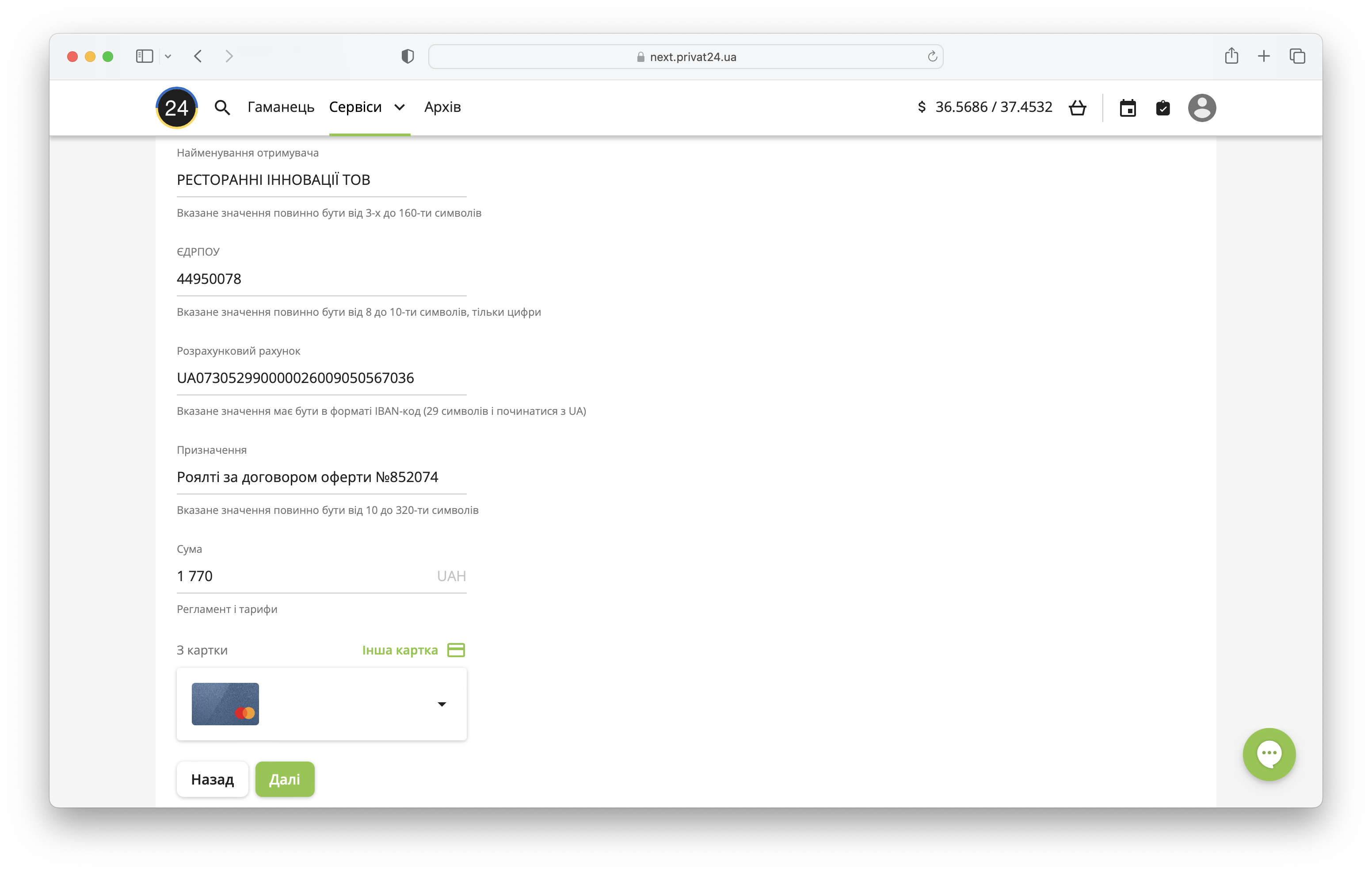 44950078, Найменування отримувача — ТОВ «РЕСТОРАННІ ІННОВАЦІЇ». -