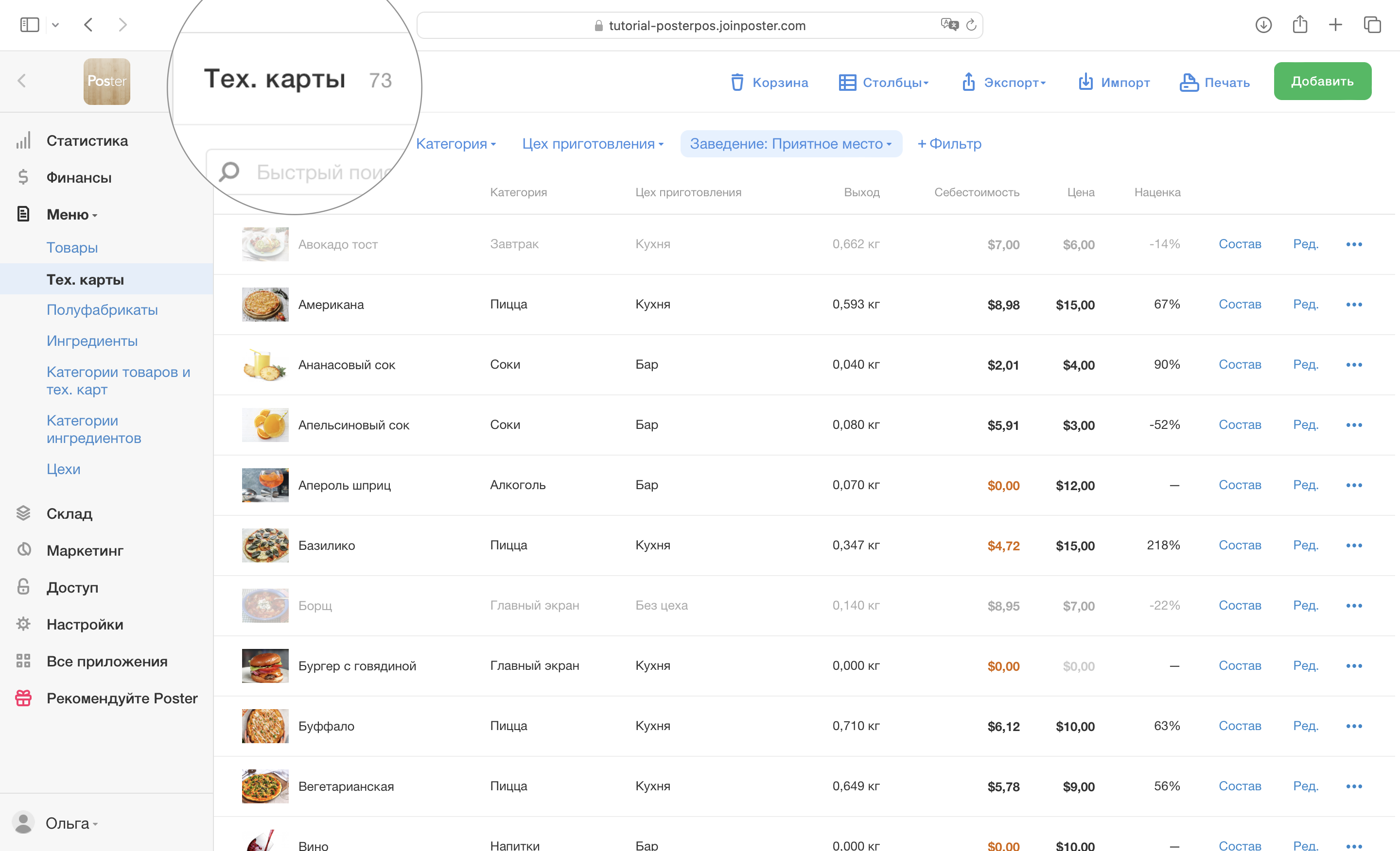 Для этого откройте вкладку Меню → Тех. карты, слева над полем быстрого поиска посмотрите общее количество тех. карт. Проверьте таким же образом количество товаров во вкладке Меню → Товары.