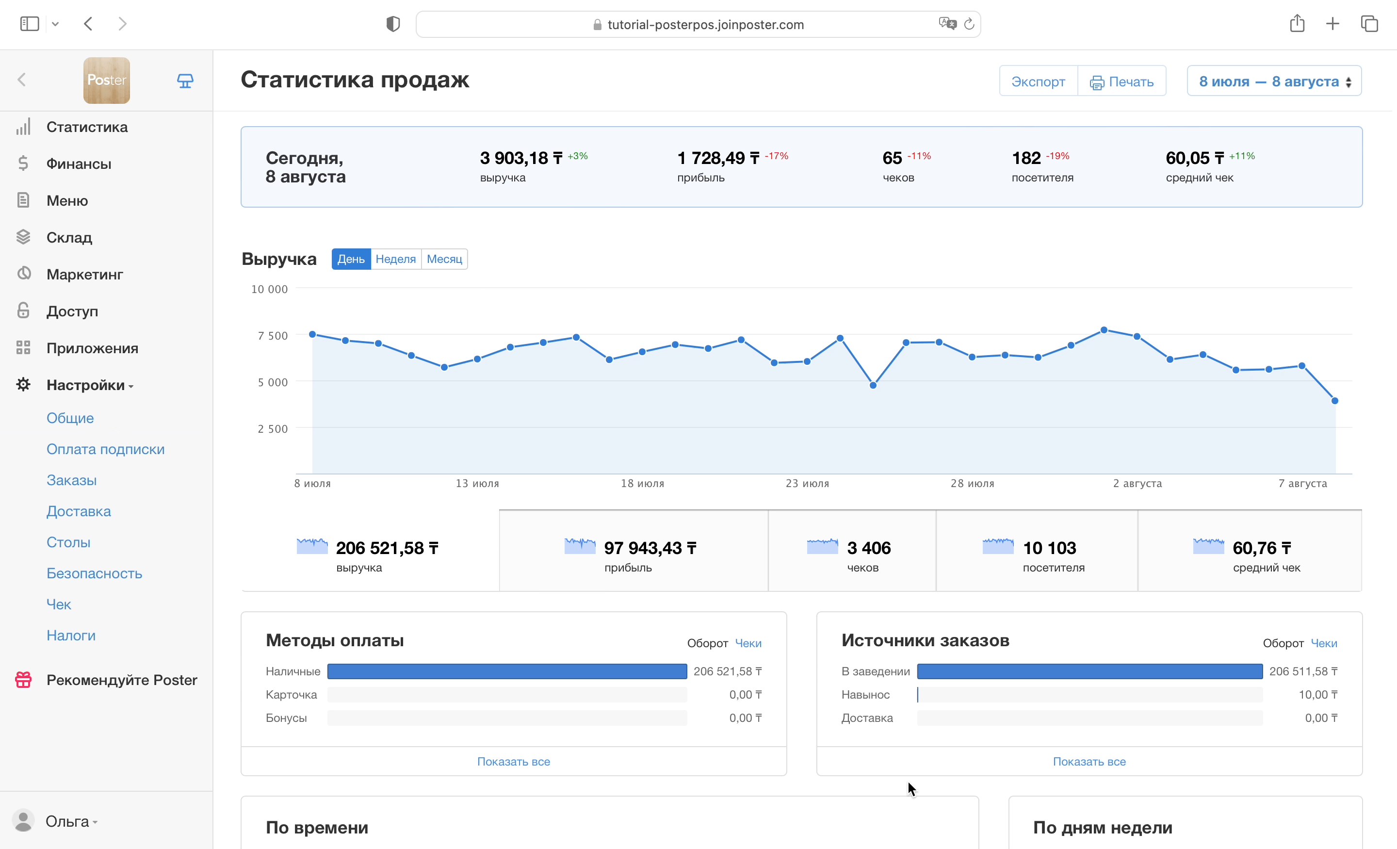 Например, если указать 2:00 ночи, как время окончания работы заведения, то чеки оплаченные с 0:00 до 2:00 ночи 21-го числа, попадут в статистику за 20-е число.