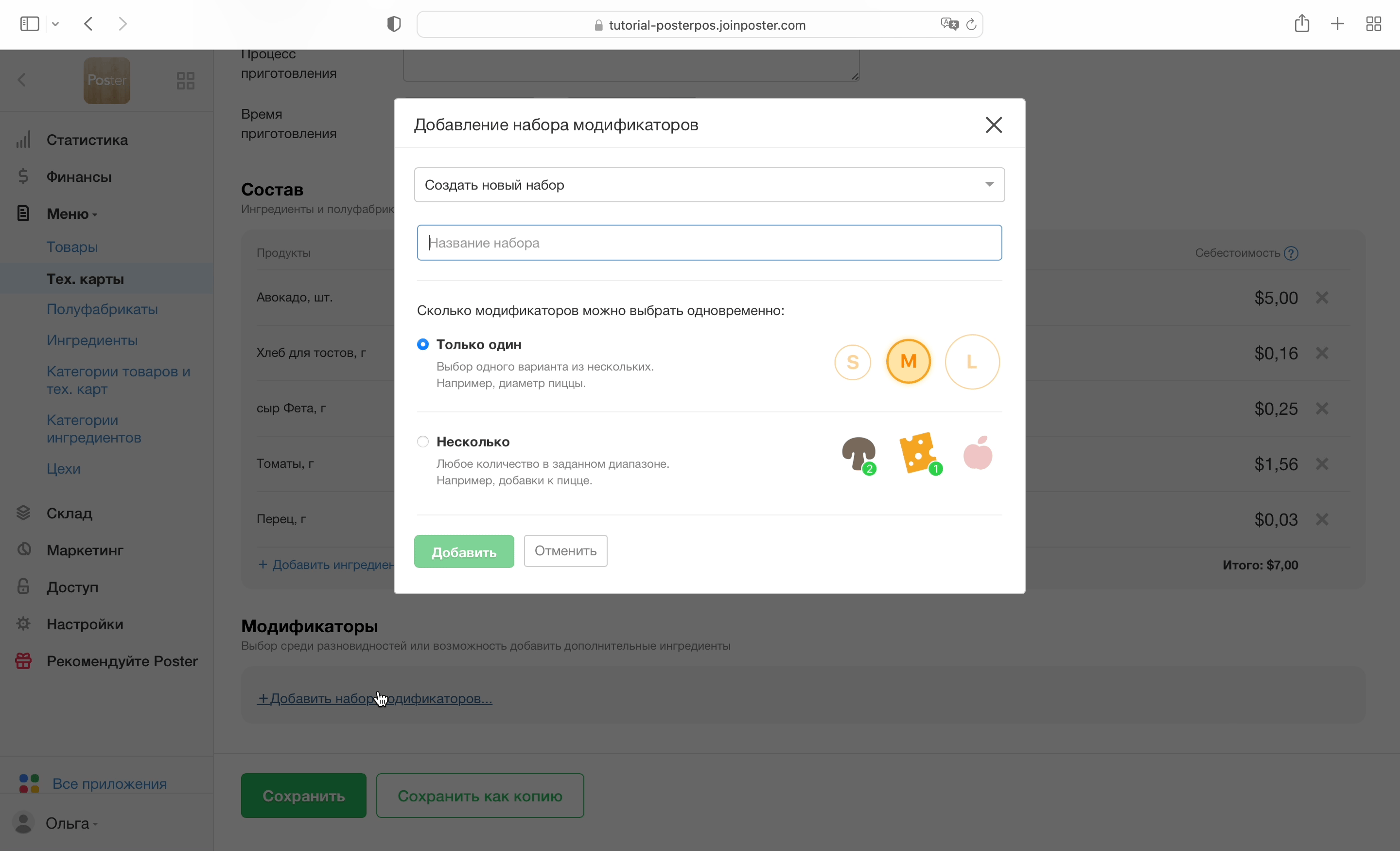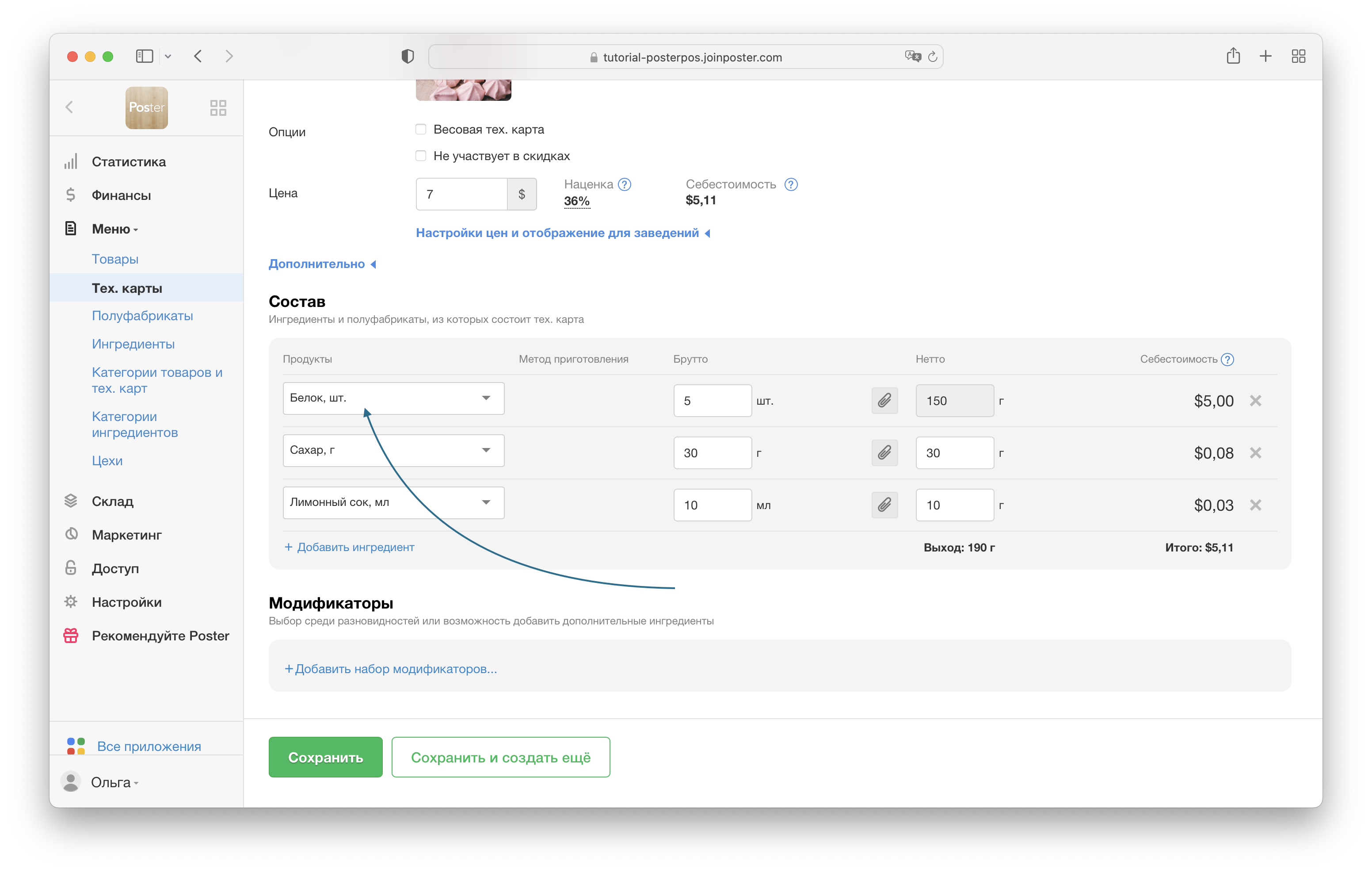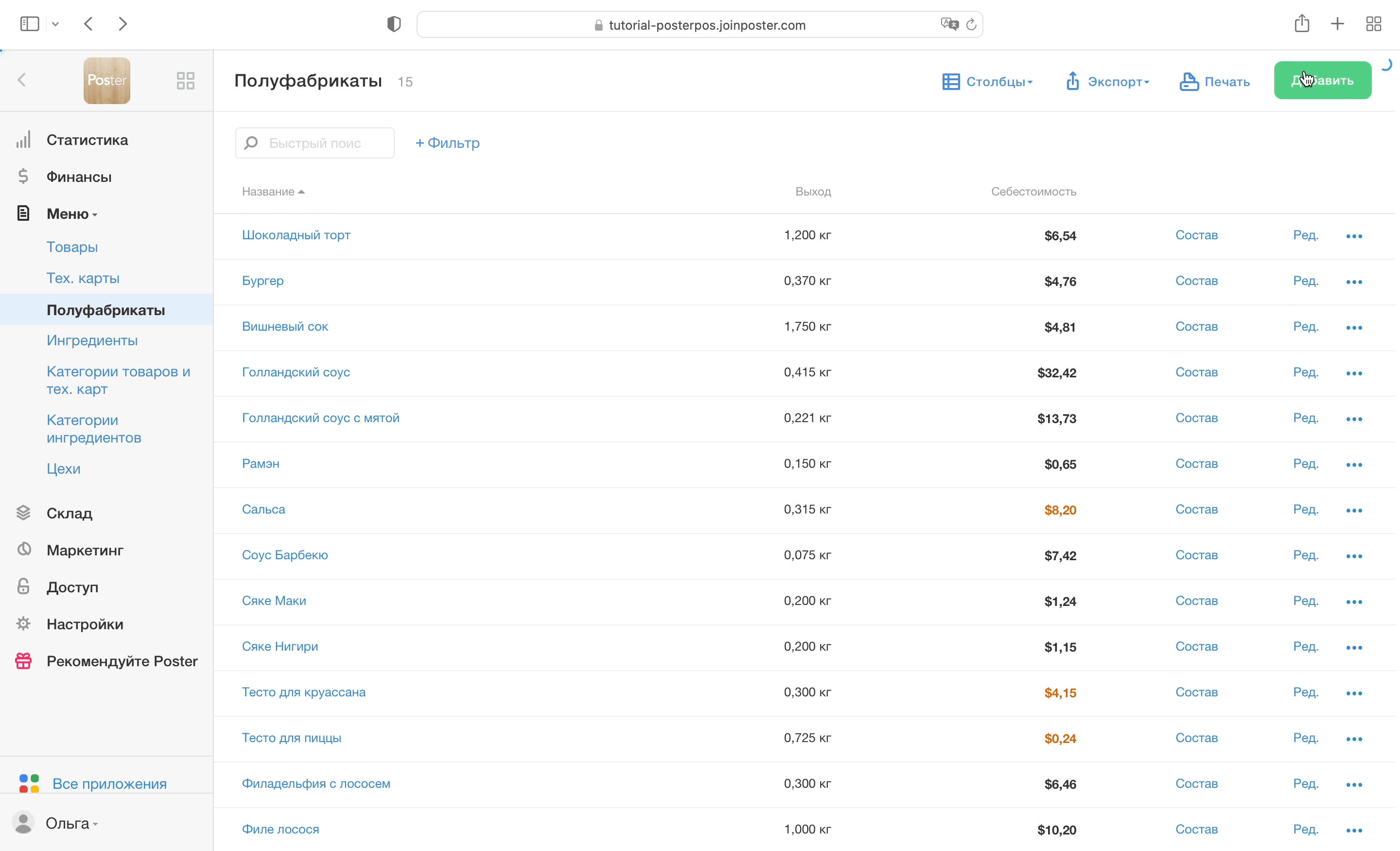 Организуйте меню, чтобы учитывать все расходы продуктов. Для этого работайте с полуфабрикатами в Poster.