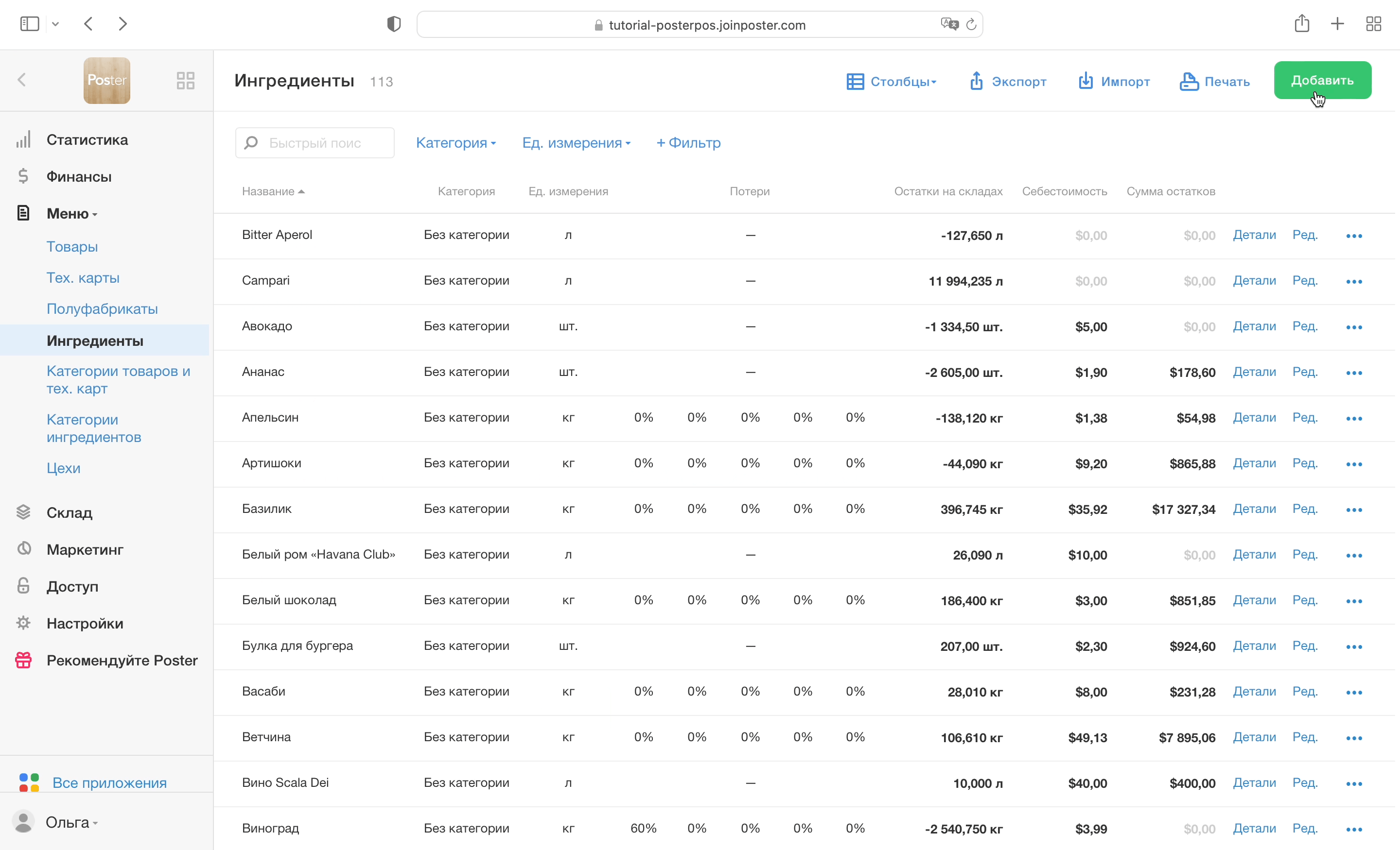 Чтобы проверить и отредактировать поставки с новыми ингредиентами, перейдите во вкладку Склад → Поставки.