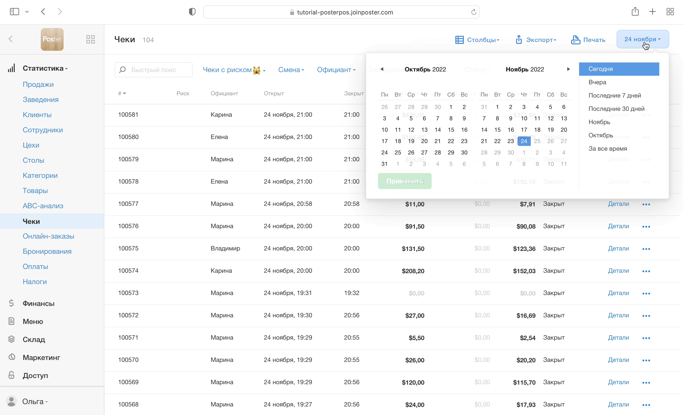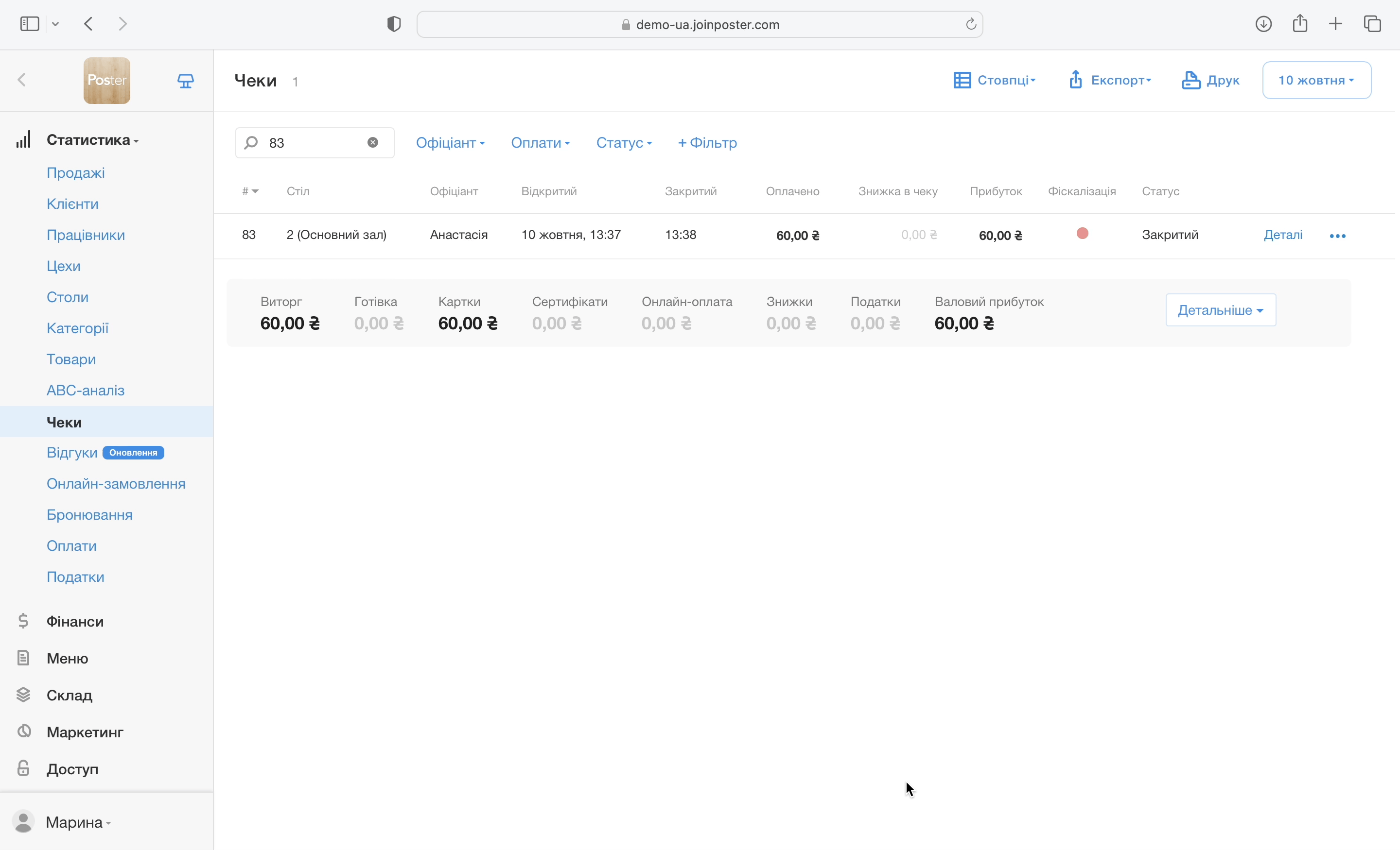Посмотрите номер, время открытия и закрытия чека, имя официанта, сумму оплаты, скидку, прибыль и статус чека.