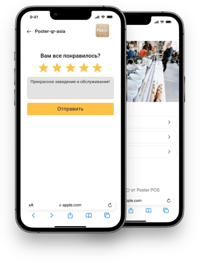 Настройте меню, оплаты, отзывы и чаевые по QR-коду. Наклейте наклейки с QR-кодом на столики, чтобы гости сразу могли просмотреть ваше меню. Если не обслуживаете гостей у столов, разместите наклейки в прикассовой зоне — гости смогут выбирать и оплачивать блюда и напитки, пока ждут в очереди.