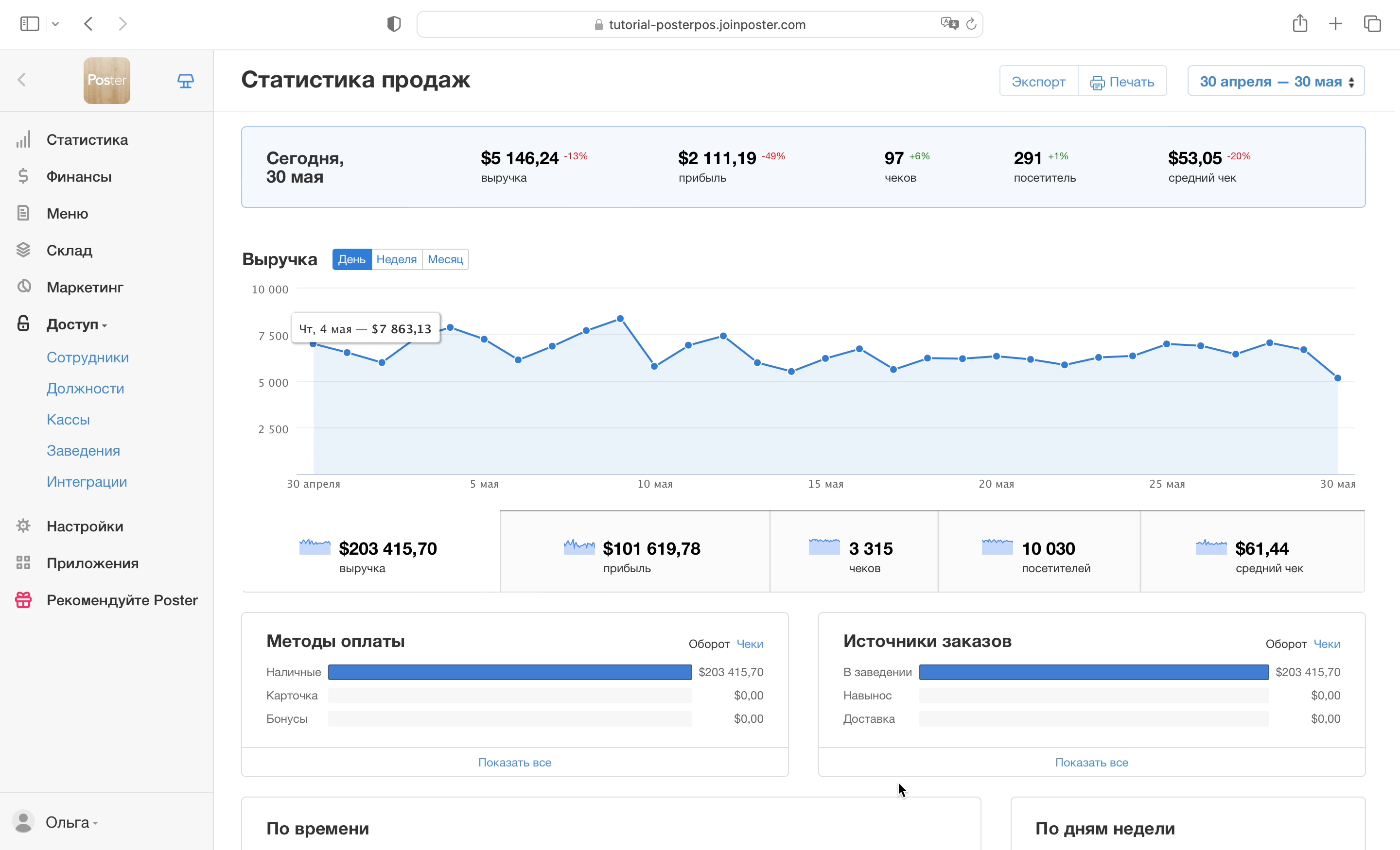 Чтобы возобновить продажи, войдите в кассу Poster. Логин и пароль посмотрите в админ-панели во вкладке Доступ → Кассы.