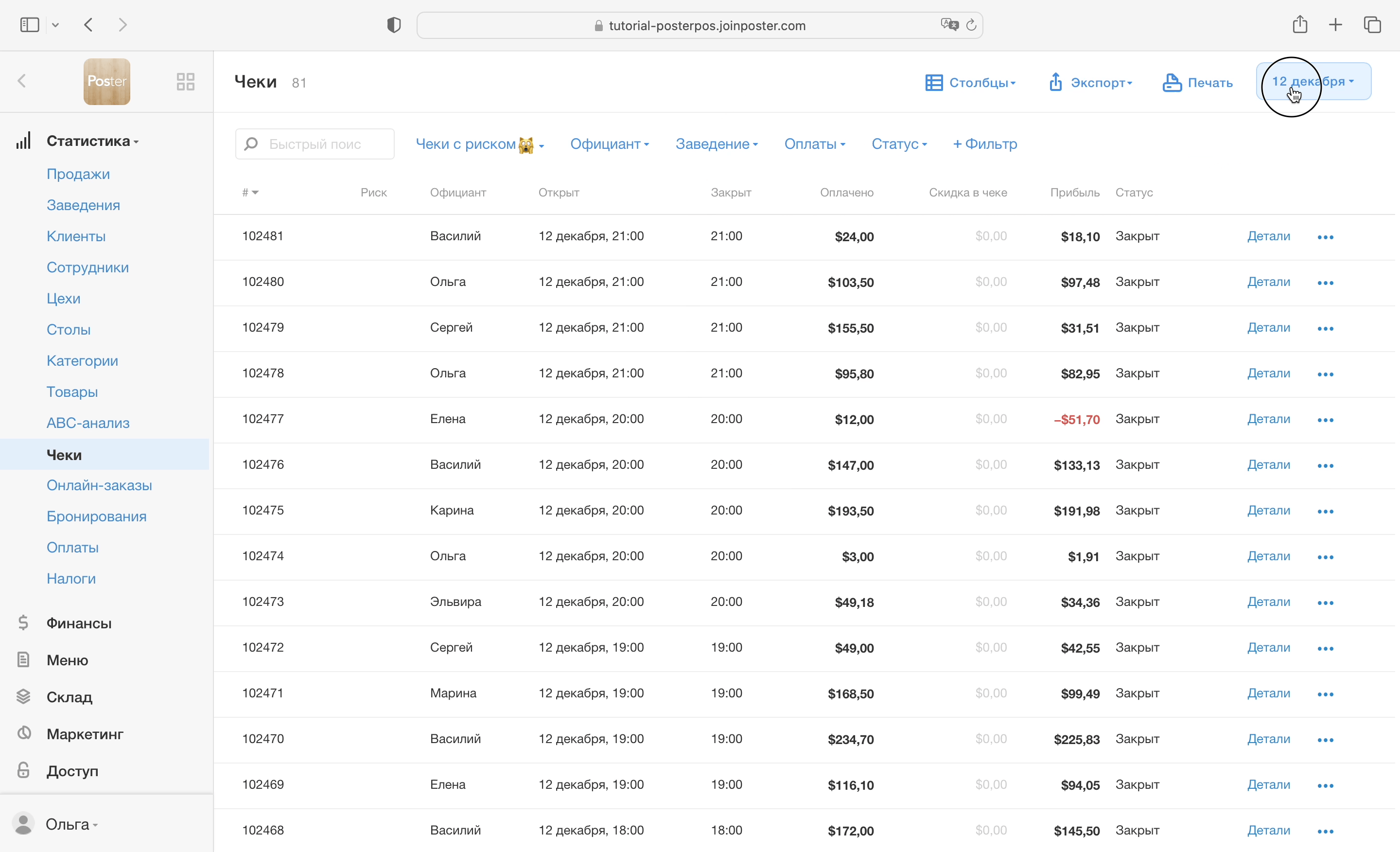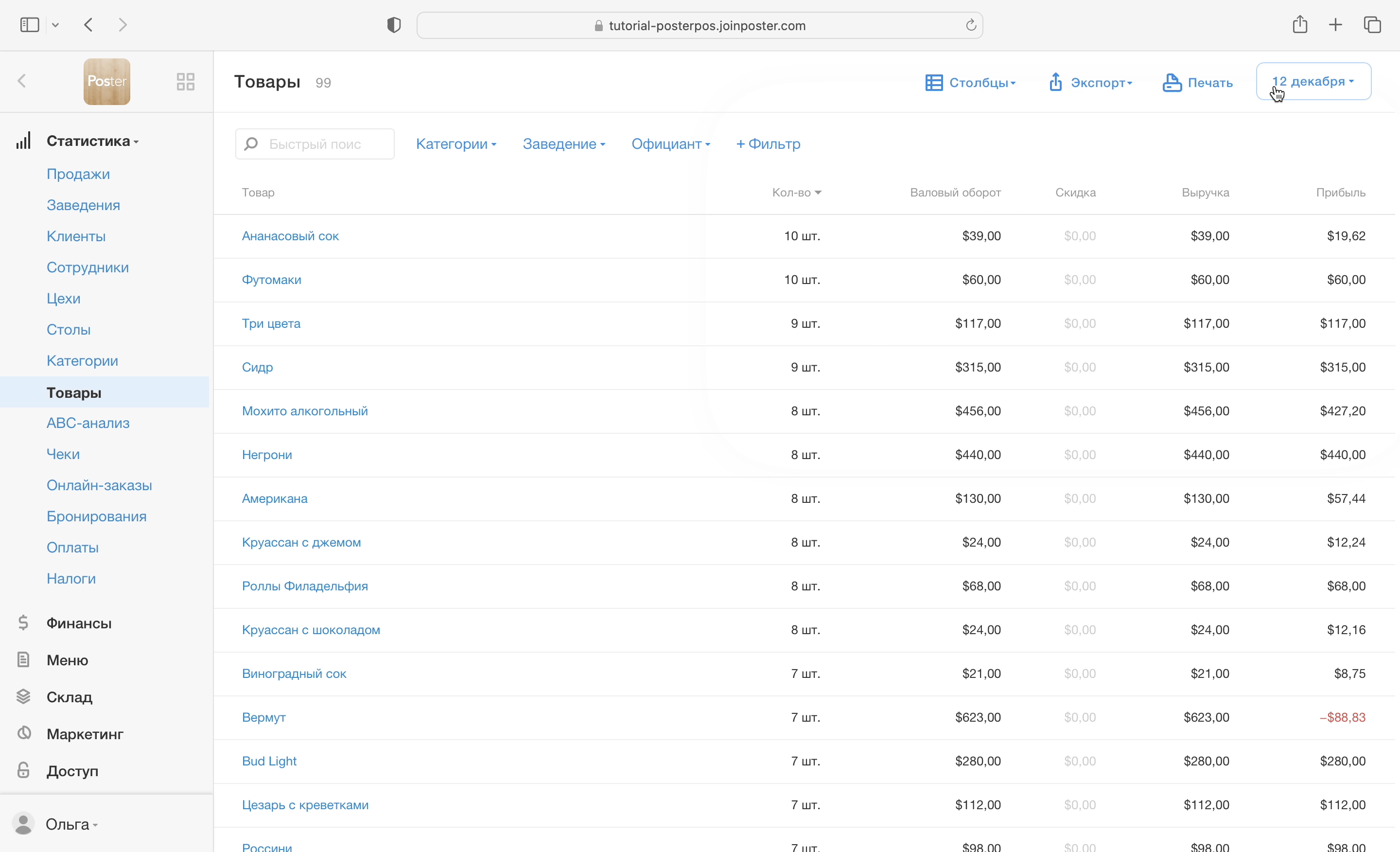 Посмотрите товары и их количество, сумму скидки, валовый оборот, выручку, прибыль и food cost.
