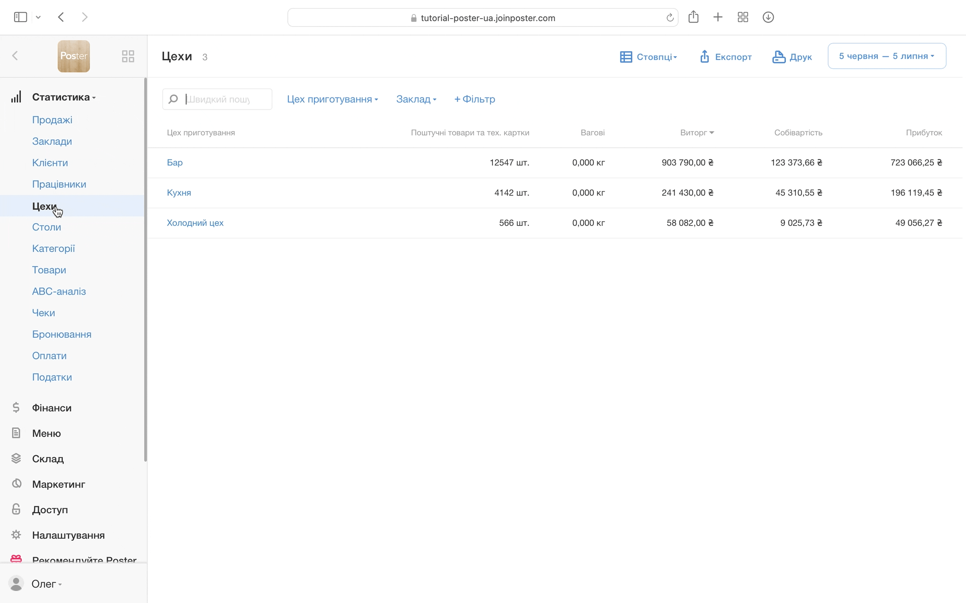 Щоб контролювати кількість проданих товарів, виторг та прибуток по бару та кухні, переглядайте статистику продажів за цехами приготування.