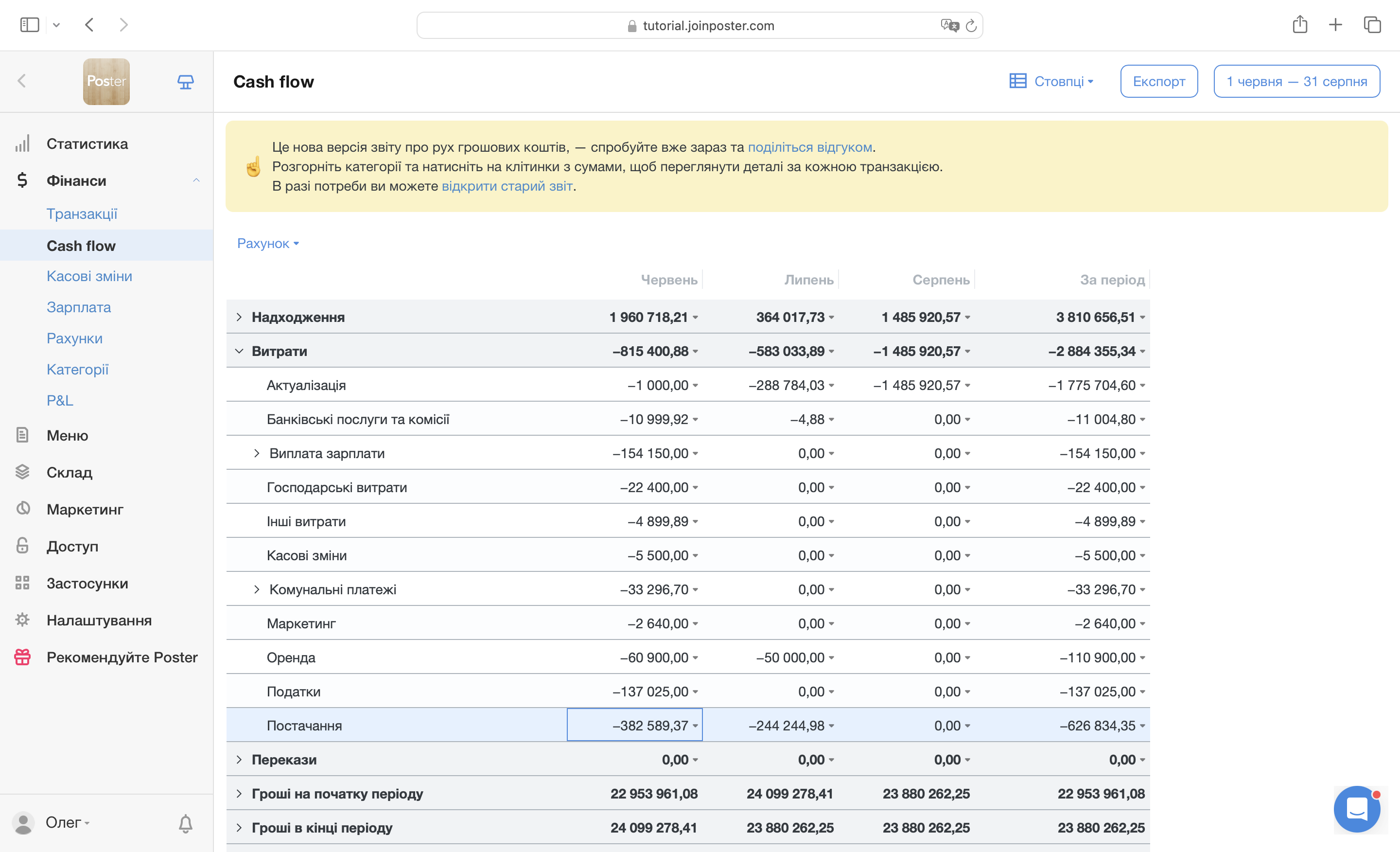 Так само, суми в оплатах постачань можуть не збігатися: у P&L витрати додаються у день створення постачання, а у Cash flow — датою фактичної оплати.