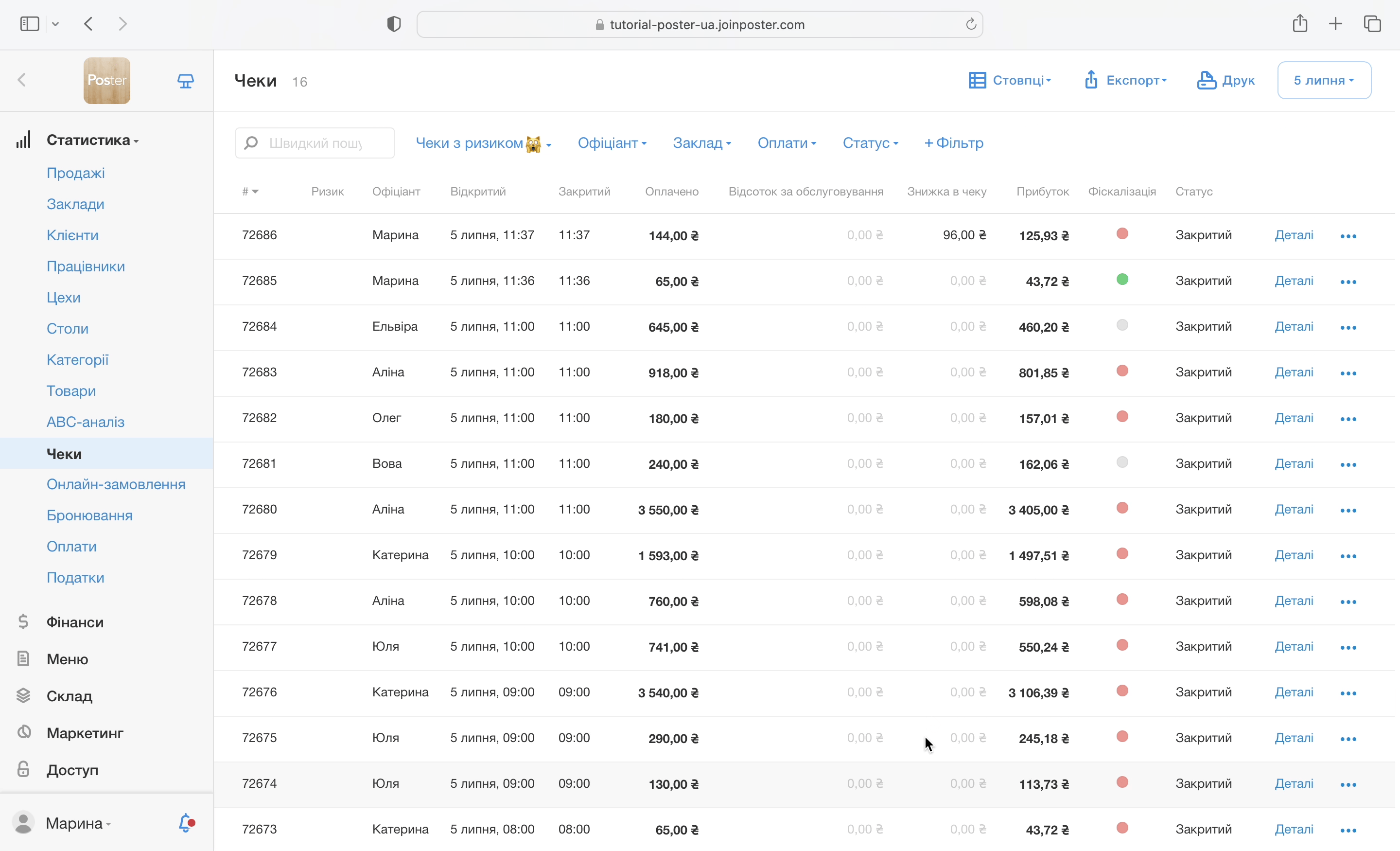 Наприклад, ви закрили на касі чек зі знижкою. Poster розрахує прибуток у вкладці Статистика → Чеки: