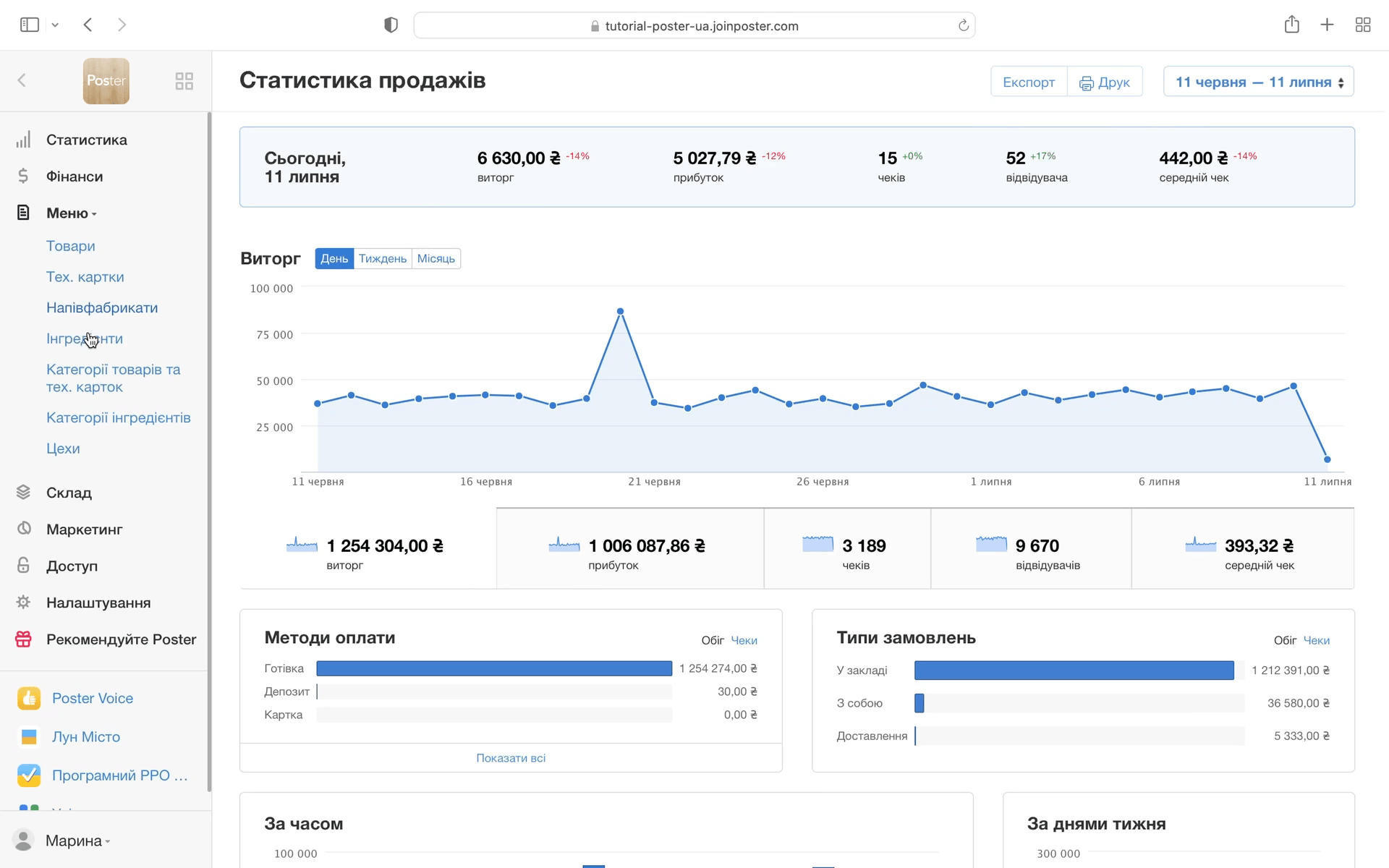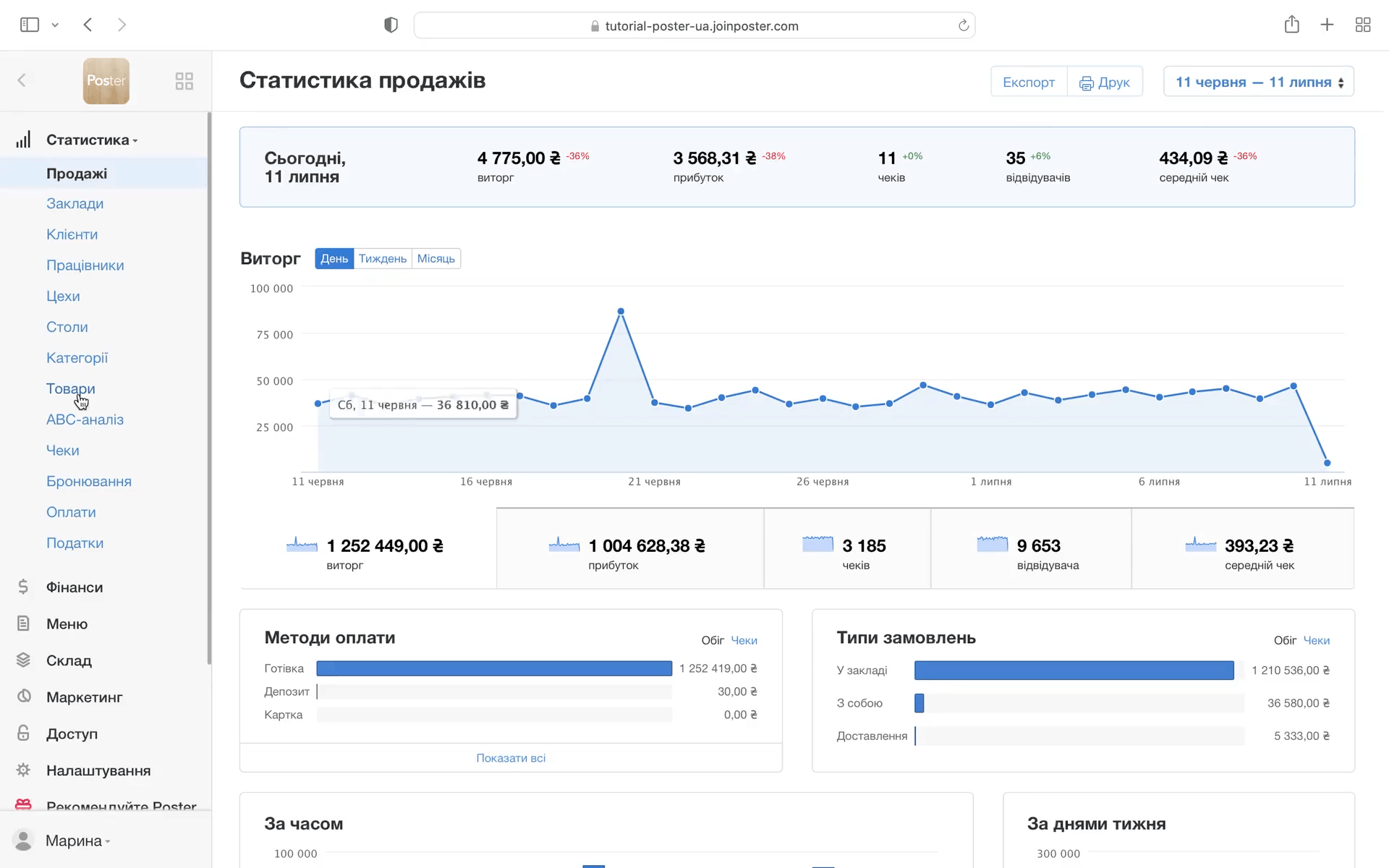 Вкладка Товари покаже кількість продажів кожної тех. картки та товару за період. Найзручніше, що можна переглядати статистику усього як меню, так і окремих категорій.