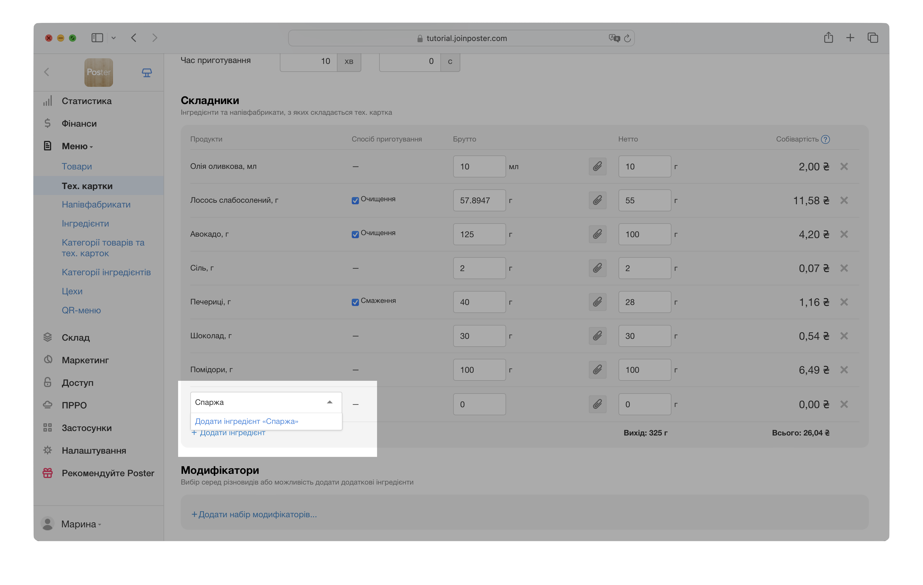 Відкрийте вкладку Меню → Інгредієнти та натисніть кнопку Додати.