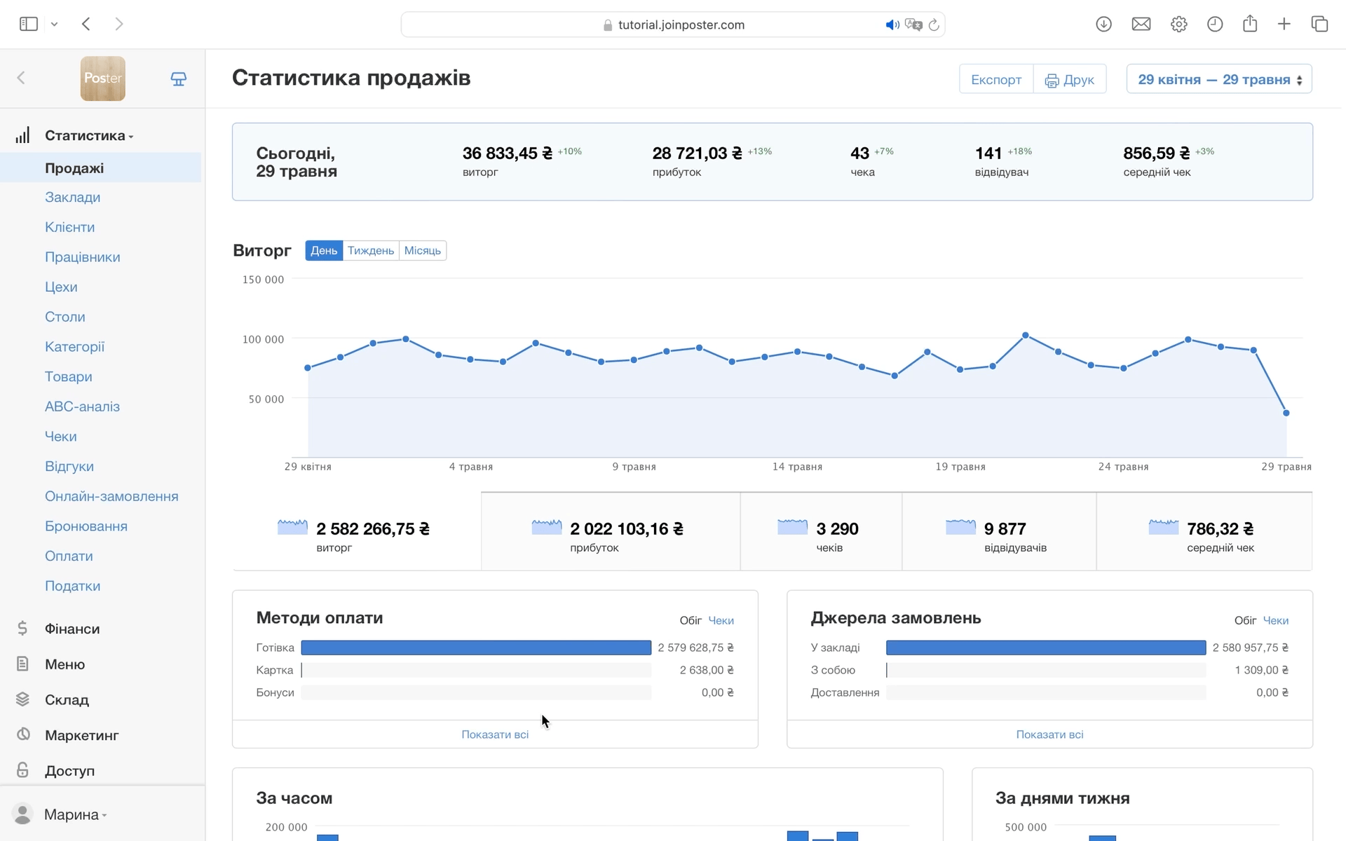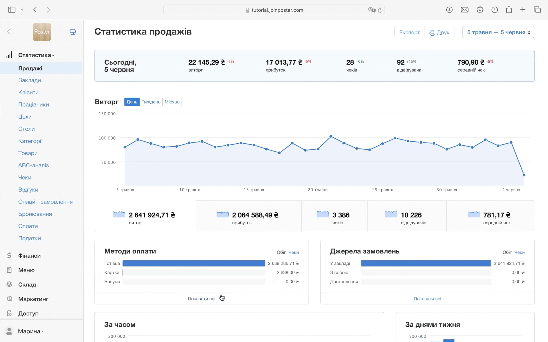 Наповніть меню в Poster товарами та тех. картками, які відображатимуться на касі офіціанта.