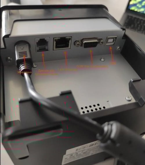 Тепер, коли принтер увімкнено, папір заправлено правильно, — підʼєднайте його до каси.