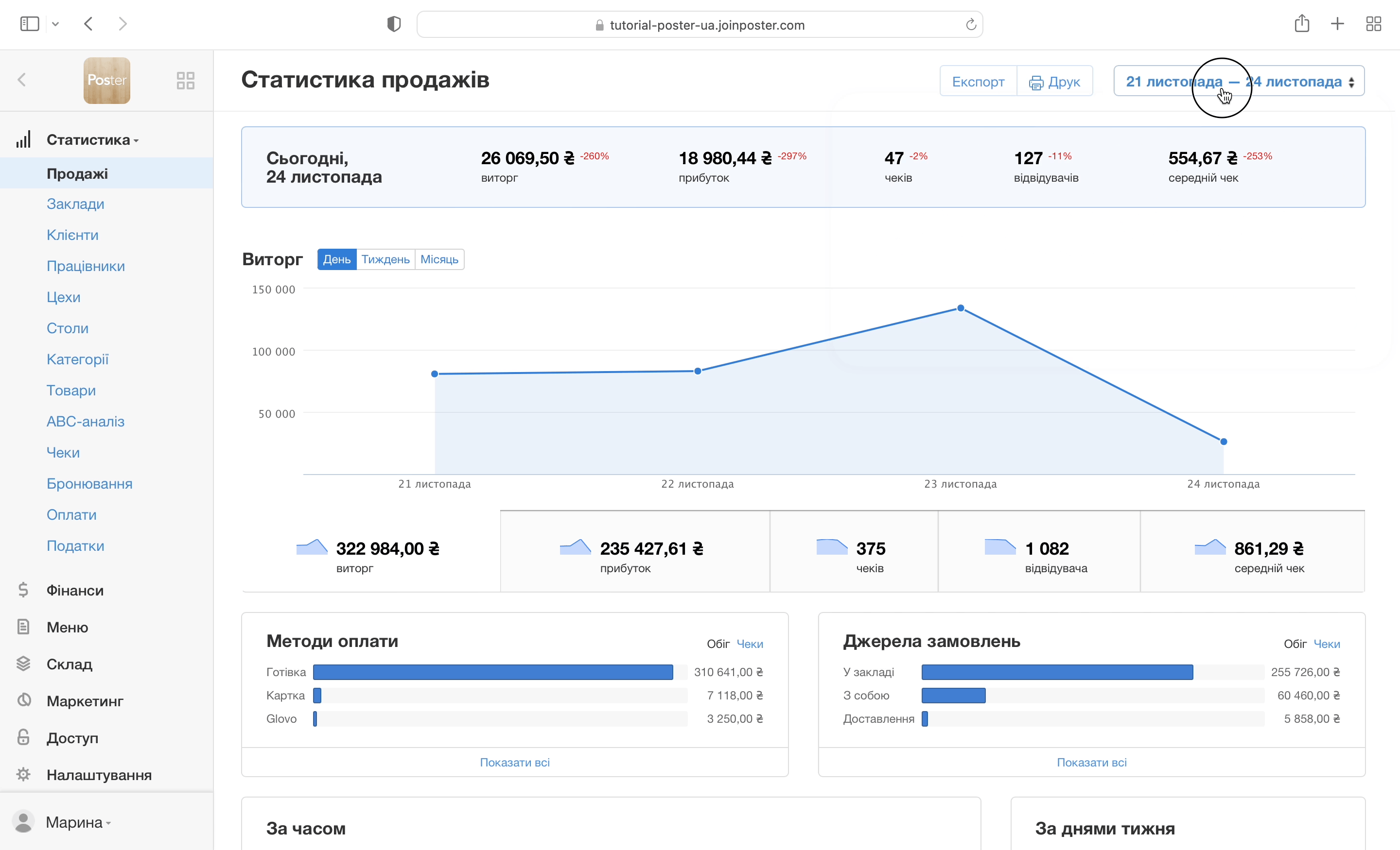 Щоб контролювати продажі у закладі, переглядайте графіки зі статистикою продажів.
