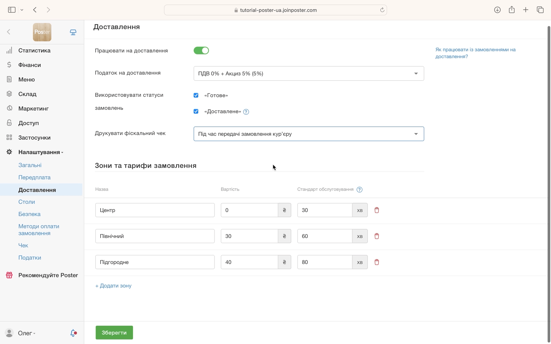 Щоб встановити стандарт обслуговування, вибрати зони міста та тарифи для кожної з них, налаштуйте роботу на доставлення для свого закладу