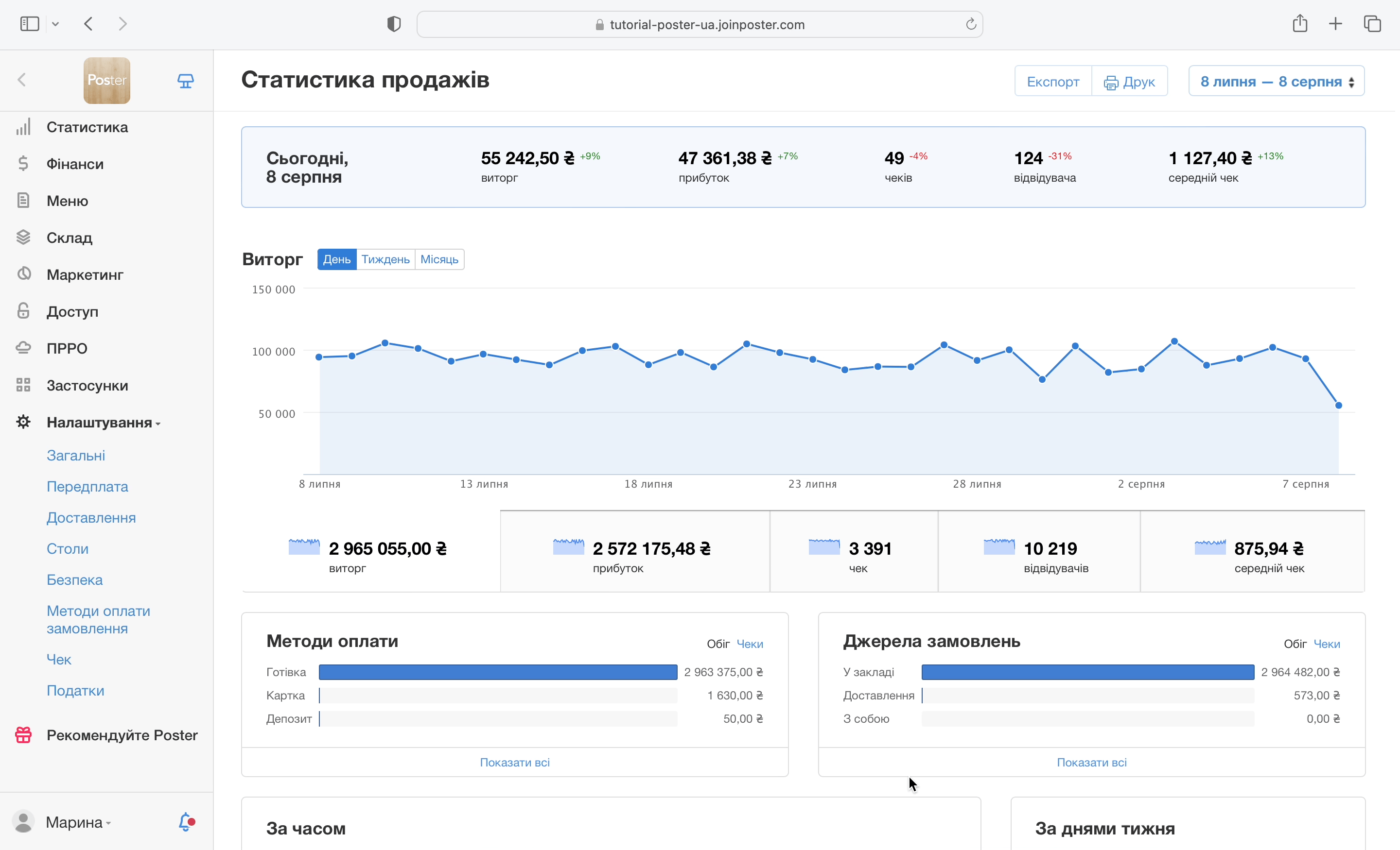 Наприклад, якщо вказати 2:00 ночі, як час завершення роботи закладу, тоді чеки, які оплачено з 0:00 до 2:00 ночі 21-го числа, потраплять до статистики за 20-е число.