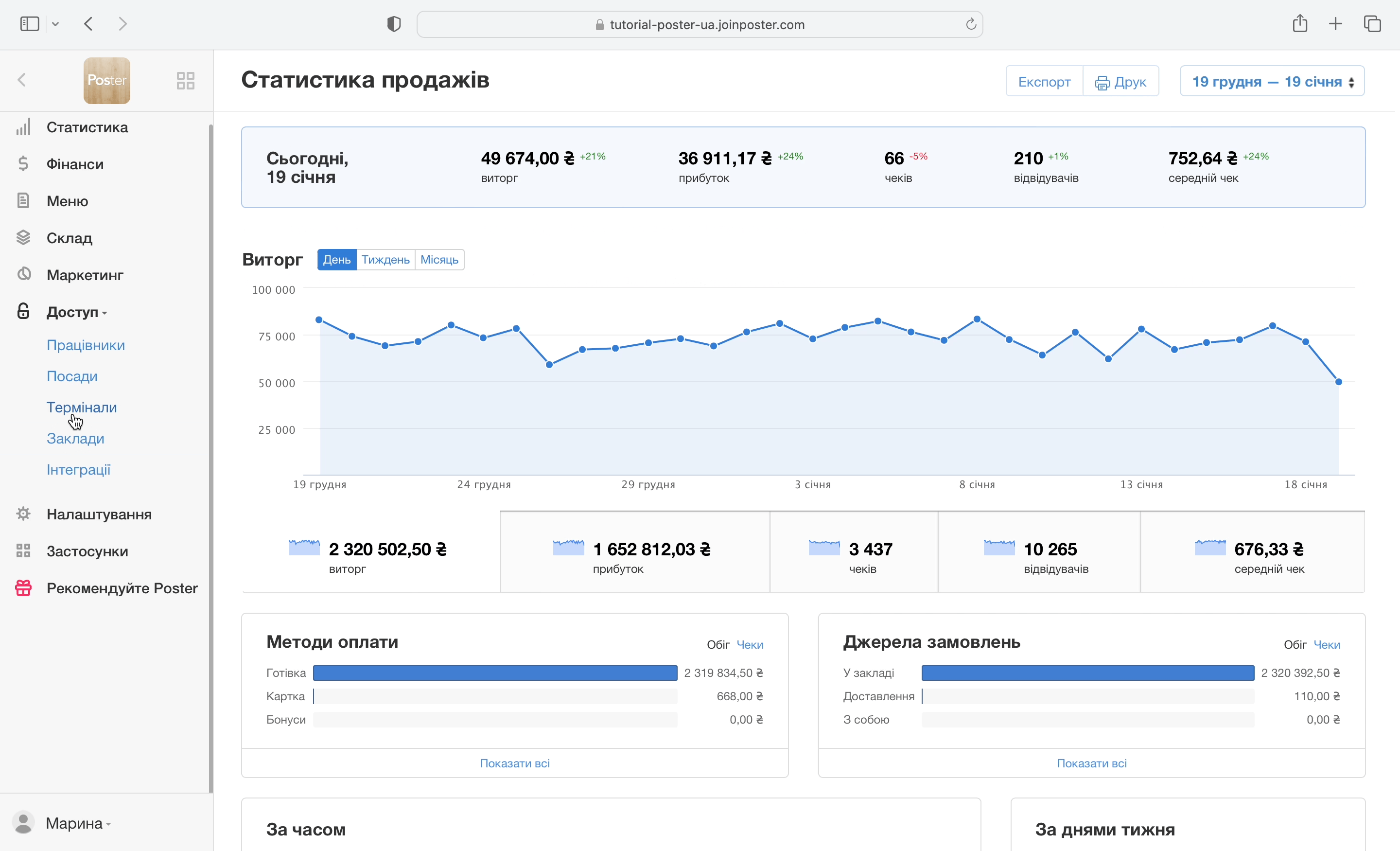 швидко переключатися між акаунтами та передивлятись статистику у мобільному застосунку Poster Boss.