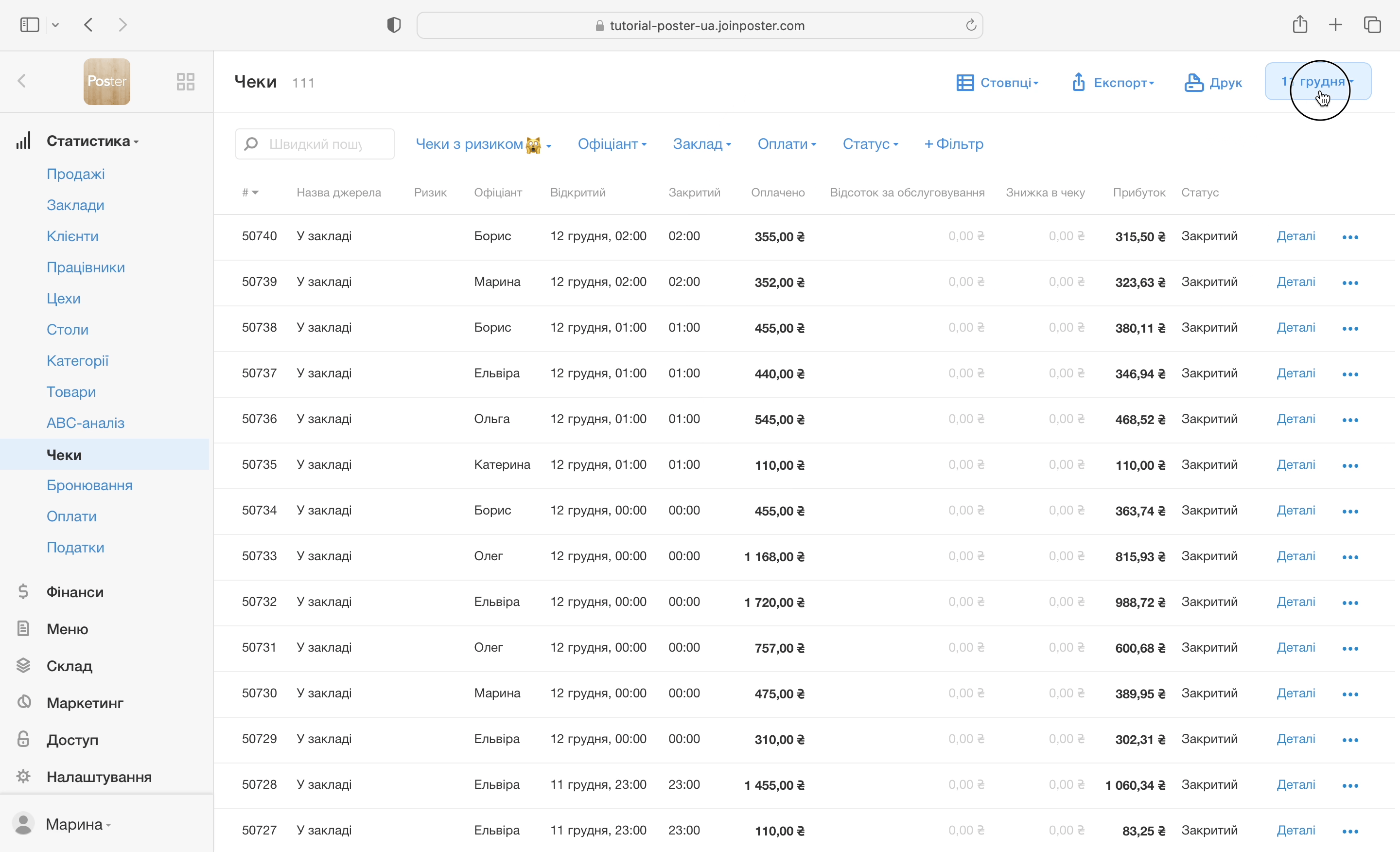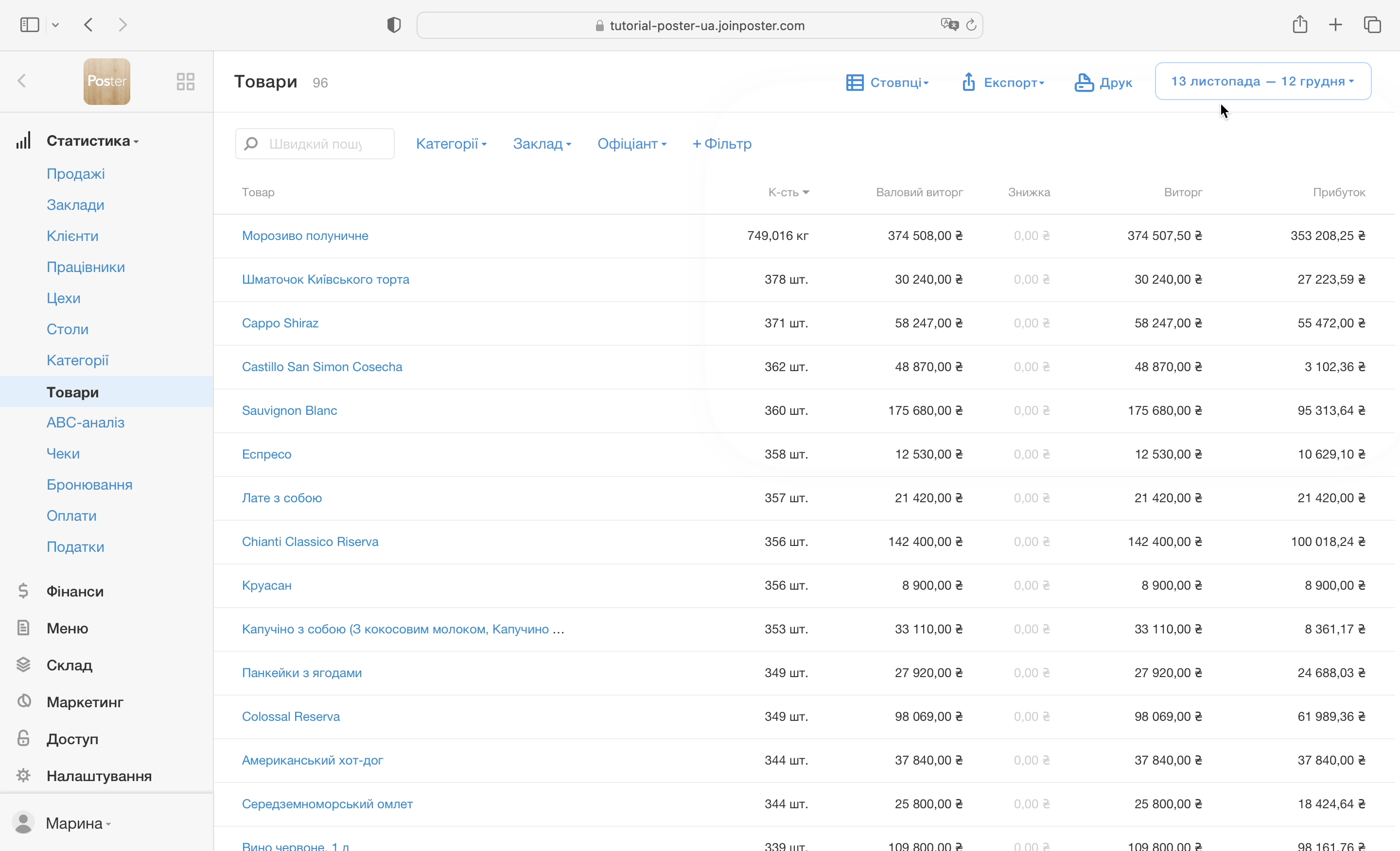 Подивіться товари та їх кількість, суму знижки, валовий обіг, виторг, прибуток та food cost.